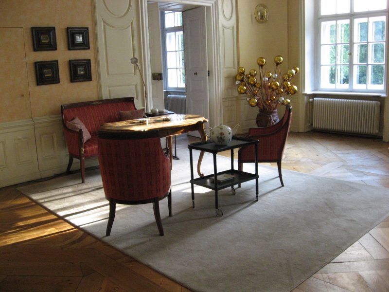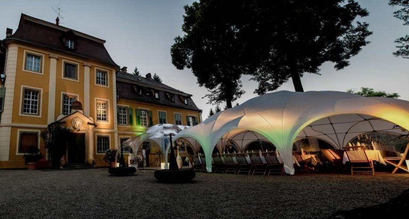 Das Schloss bietet heute eine exklusive Kulisse für besondere Anlässe: Das große Esszimmer im Obergeschoss fasst bis zu 60 Gäste, ideal für elegante Dinner oder Besprechungen. Mit einem stilvollen Zelt im Innenhof können auch größere Gesellschaften empfangen werden.
